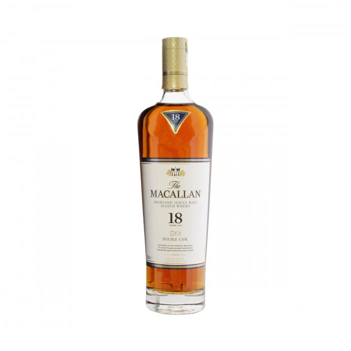 The Macallan Double Cask 18 Years Old, 2023 Release, is a perfectly balanced single malt whisky matured for 18 years in both American and European sherry seasoned oak casks. Sherry seasoned American oak adds delicate vanilla to the subtle spice of European oak, delivering a whisky with a sweeter, warmer taste and character. Bottled at 43% abv.